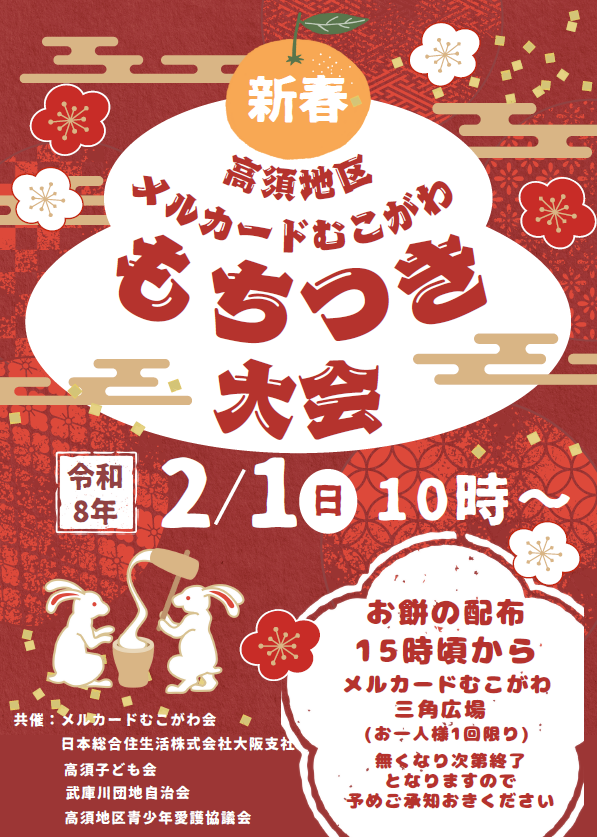 新春もちつき大会が行われます 2026/1/19 おしらせ, イベントのお知らせ 来たる2月1日午前10時~恒例の新春もちつき大会が行われます。 今年は80kgのもちをつきますので、ついてみたい方は是非メルカードむこがわの三角広場にお集まりください。 またお餅の配布は15:00~行います。なくなり次第終了となりますのでご了承ください。